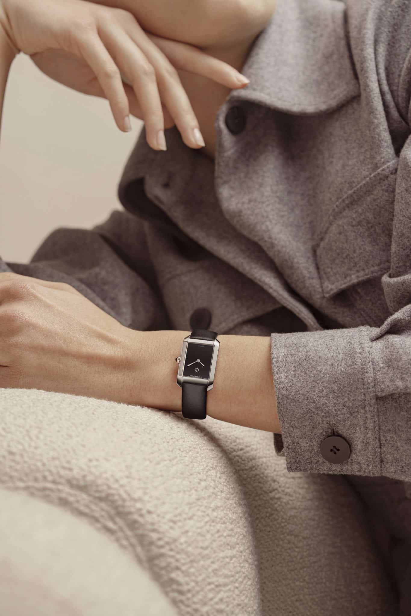 With the new Hampton M0A10760, the designers and watchmaking experts of the Les Brenets Manufacture have brought forth one of their most absolute examples of the Brand’s structural, graphic minimalism. In polished stainless steel, the case features harmonious dimensions: 35 x 22.2 mm for 6.9 mm of thickness. A scratch-proof domed sapphire crystal protects it. The solid case back may be custom-engraved upon request.