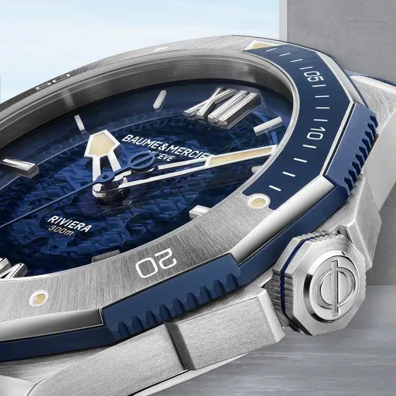 That watchmaking vision inherited from the Baume family, which has endured for nearly 200 years, shines through the dashing Riviera collection. The brand defied the watchmaking codes of the times when, in 1973, it revealed an unprecedented case with a dodecagonal bezel topped with a flat-linked metal strap. It got noticed and became an object of desire, and here it is, fifty years later, still just as creative. As it explores a spectrum of colors and a variety of features, this iconic timepiece shows its resemblance to the Riviera, the sea resort that gave rise to it: that special style, inimitable atmosphere, contrast, emotion…
